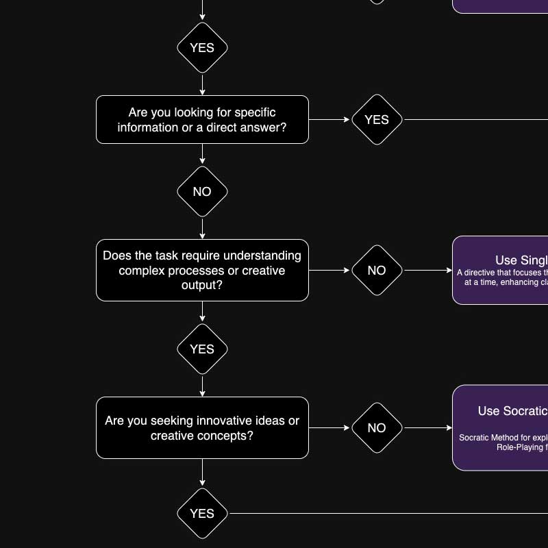 Deciding which prompting technique to use can be challenging. Our decision tree simplifies this process by guiding you through a series of questions to determine the best approach based on your specific needs and objectives.